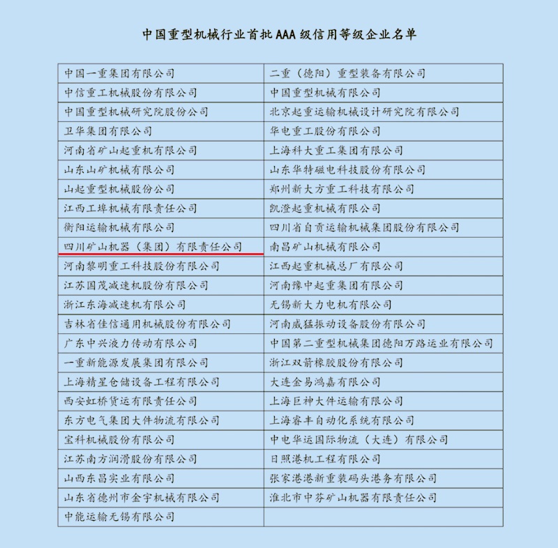 以下為中國(guó)重型機(jī)械行業(yè)首批AAA級(jí)信用等級(jí)企業(yè)名單: