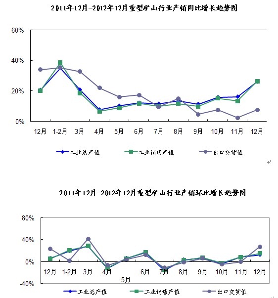 2012年1-12月份,全國重型礦山機(jī)械行業(yè)的發(fā)展形勢有所回升,工業(yè)總產(chǎn)值和銷售產(chǎn)值同比增速明顯上升,環(huán)比增速平緩,出口交貨值同、環(huán)比增速均有所回升。